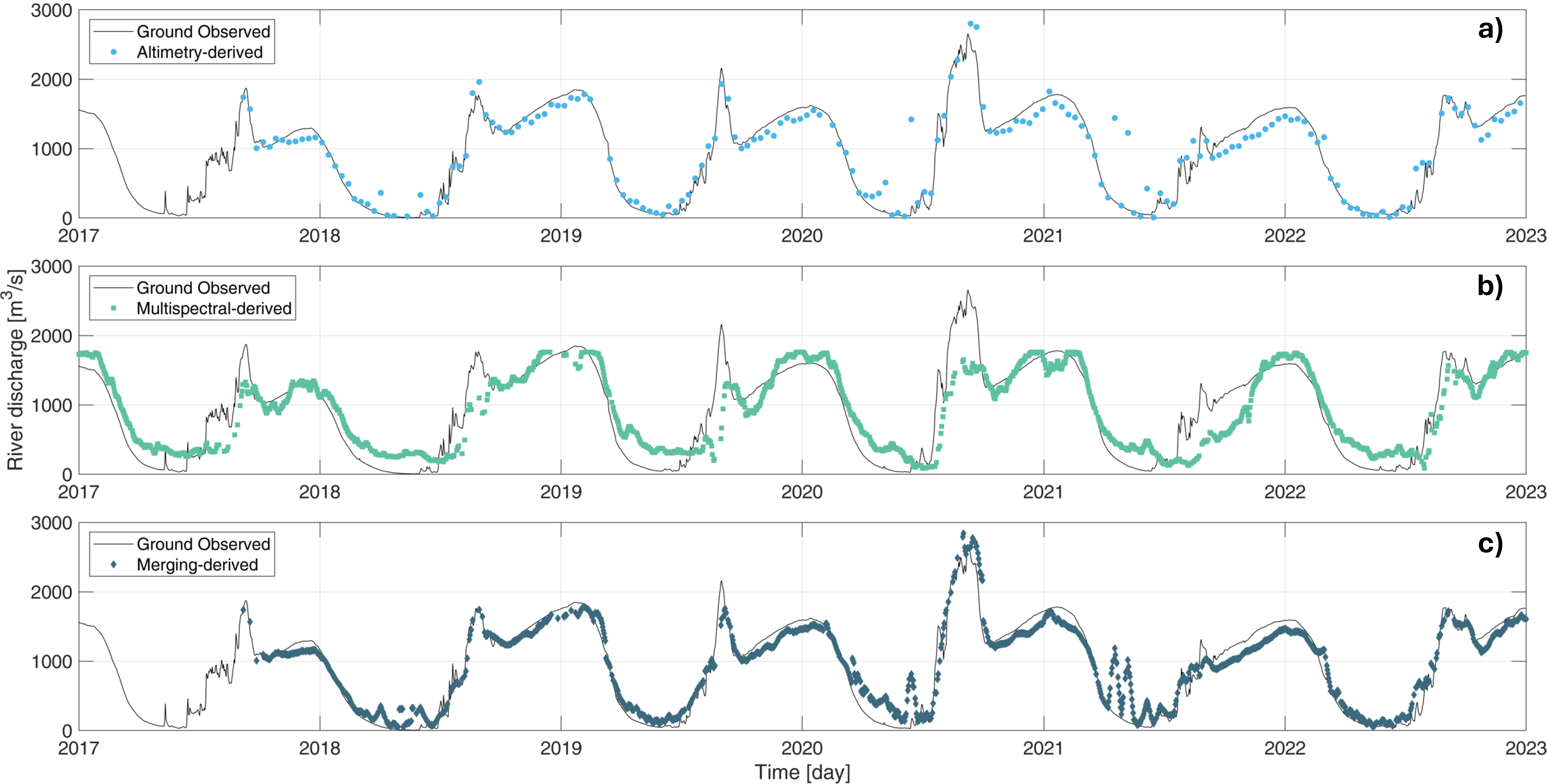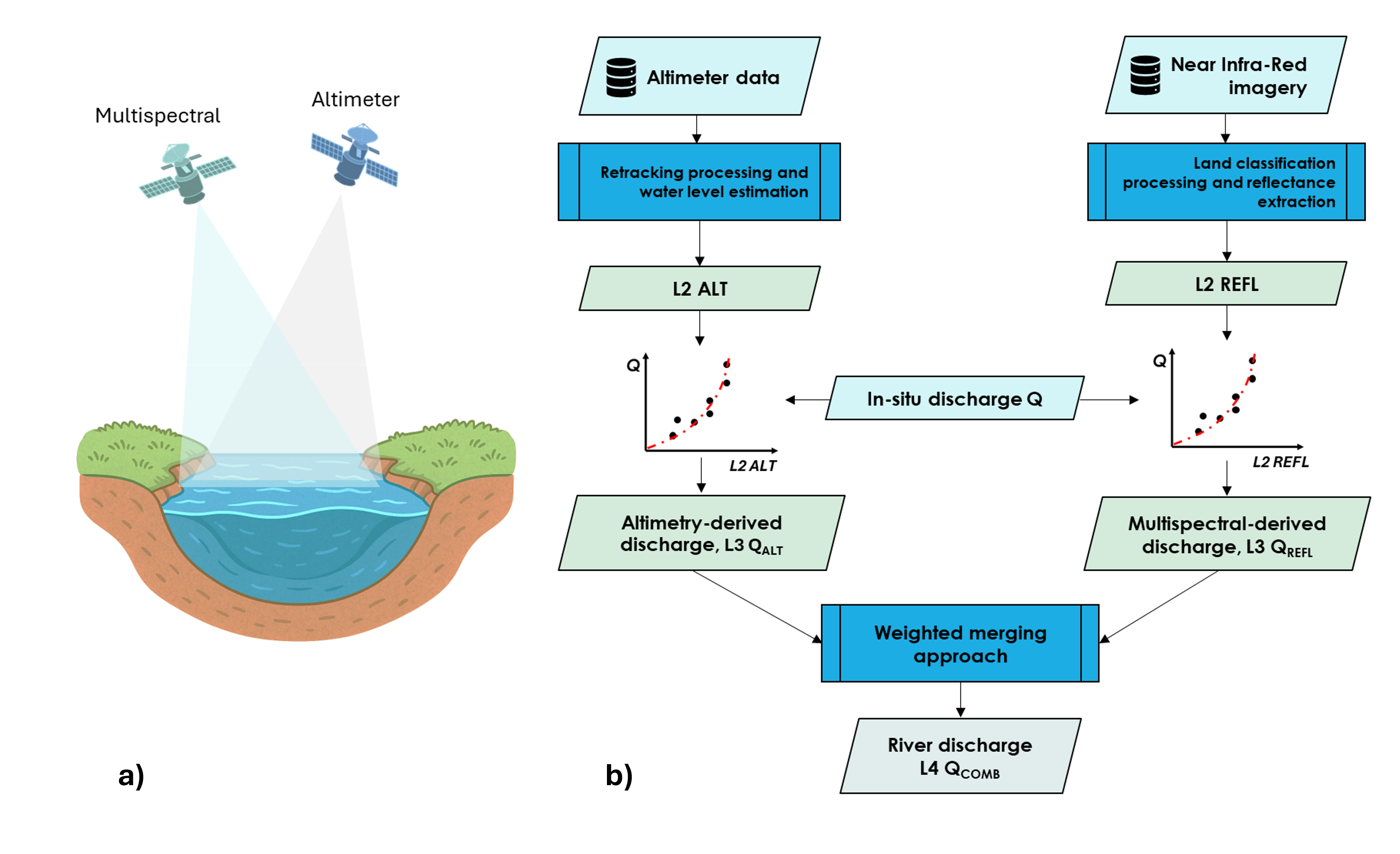 Finally, the river discharge algorithms are implemented using single-sensor inputs ((L3 QALT, L3 QREFL) and multi-sensor integration (L4 QCOMB), which combines water level and reflectance-based flow proxies. A validation process against ground based and modelled discharge data is carried out using standard hydrological performance metrics.